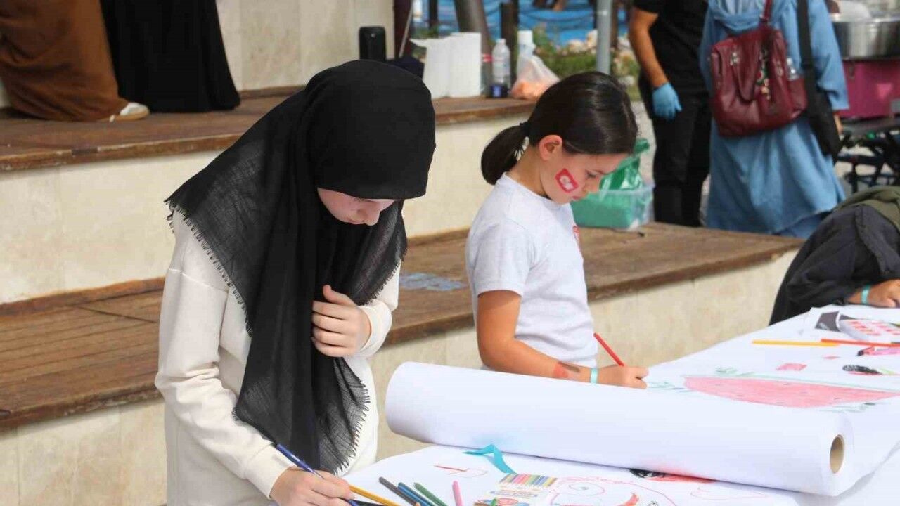 Yetim Vakfı Muğla Temsilciliği tarafından Şehit Fethi Bey Parkı’nda gerçekleştirilen programa çeşitli sivil toplum kuruluşu temsilcileri, öğrenciler ve aileler katıldı. Etkinlikte çocuklar yerlere konulan tuvallere resimler yaparak Gazze’ye destek mesajlarını yansıttı. Çizimlerde Mescid-i Aksa, Türk ve Filistin bayrakları ile boykot çağrısı yapılan ürünler ön plana çıktı. Çocukların yüzlerine Türk ve Filistin bayrakları çizildi, ayrıca pamuk şeker ikram edildi.