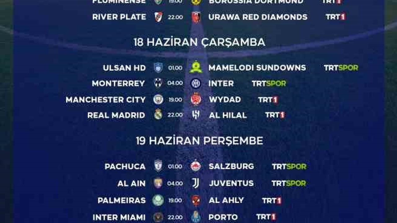 Dünya futbolunun kulüp düzeyindeki en prestijli turnuvalarından biri olan FIFA Kulüpler Dünya Kupası’nda 15-22 Haziran 2025 tarihleri arasında 30 karşılaşma oynanacak. Turnuva maçları TRT 1, TRT Spor ve tabii platformu üzerinden canlı olarak futbolseverlerle buluşacak.