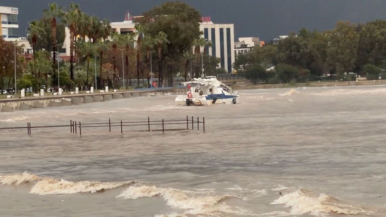 Antalya'da sağanak yağmur ve fırtına öğle saatlerinden itibaren etkisini gösterirken Finike ilçesinde açıkta demirli bir tekne kıyıya sürüklendi.
