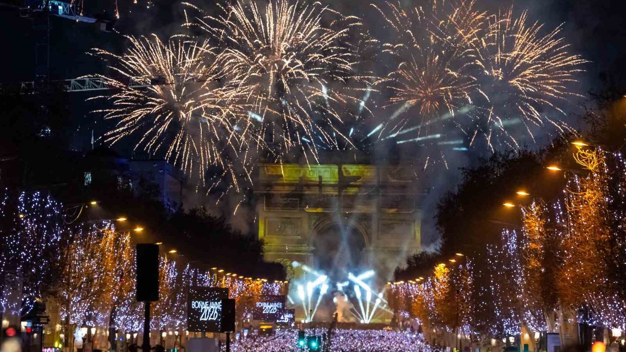 Fransa'nın başkenti Paris'te yeni yıl kutlamaları görkemli görüntülere sahne oldu. Yeni yılı karşılamak için Paris'teki dünyaca ünlü Şanzelize Caddesi'nde toplanan binlerce kişi, Arc de Triomphe (Zafer Takı) Anıtı'na yansıtılan video görüntüleri ve ışık gösterilerinin yanı sıra Eyfel Kulesi çevresindeki etkileyici ışık ve havai fişek gösterileriyle keyifli anlar yaşadı. Geri sayımın ardından binlerce kişi, Paris semalarını aydınlatan görkemli havai fişekler eşliğinde 2026'ya 'merhaba' dedi.