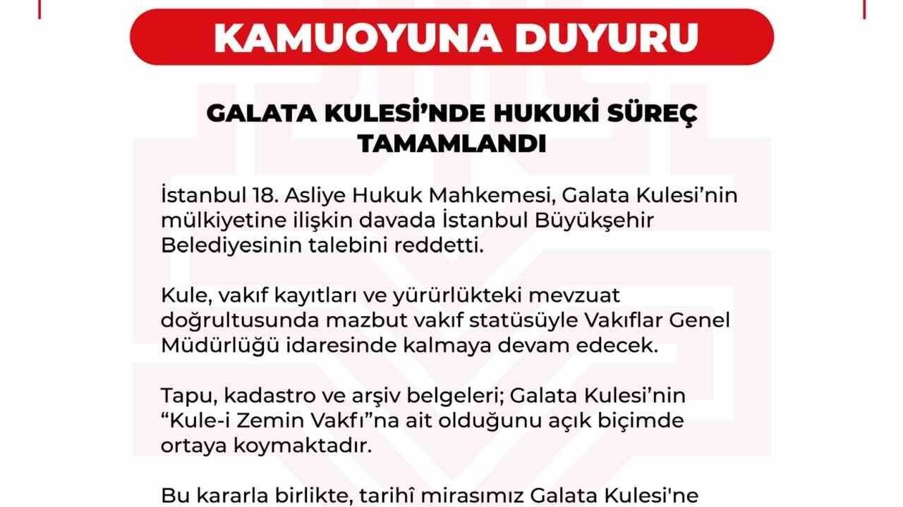Vakıflar Genel Müdürlüğü'nden yapılan açıklamada, 'İstanbul 18. Asliye Hukuk Mahkemesi, Galata Kulesi'nin mülkiyetine ilişkin davada İstanbul Büyükşehir Belediyesinin talebini reddetti. Kule, vakıf kayıtları ve yürürlükteki mevzuat doğrultusunda mazbut vakıf statüsüyle Vakıflar Genel Müdürlüğü idaresinde kalmaya devam edecek. Tapu, kadastro ve arşiv belgeleri; Galata Kulesi'nin 'Kule-i Zemin Vakfı'na ait olduğunu açık biçimde ortaya koymaktadır. Bu kararla birlikte, tarihi mirasımız Galata Kulesi'ne yönelik hukuki süreç kesinlik kazandı' denildi.