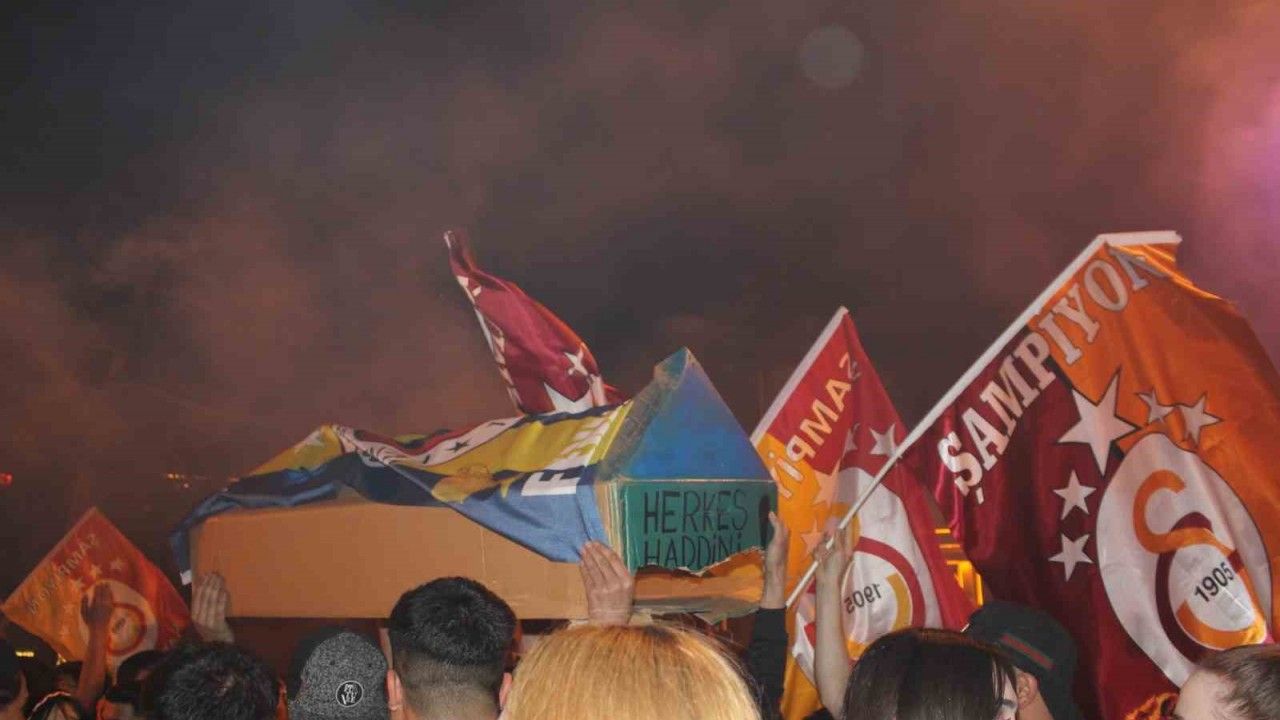 Trendyol Süper Lig’de Galatasaray’ın Kayserispor’u mağlup ederek şampiyonluğunu ilan etmesinin ardından Kayseri’de Galatasaray taraftarları şampiyonluğu doyasıya kutladı. Şampiyonluk kutlamalarına Fenerbahçeli taraftarlar da katılırken, Galatasaraylılar Fenerbahçe’nin tabutunu taşıdı.