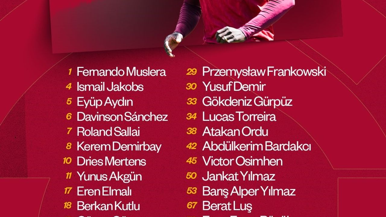 "Fernando Muslera, Ismail Jakobs, Eyüp Aydın, Davinson Sanchez, Roland Sallai, Kerem Demirbay, Dries Mertens, Yunus Akgün, Eren Elmalı, Berkan Kutlu, Günay Güvenç, Gabriel Sara, Ahmed Kutucu, Kaan Ayhan, Elias Jelert, Carlos Cuesta, Przemyslaw Frankowski, Yusuf Demir, Gökdeniz Gürpüz, Lucas Torreira, Atakan Ordu, Abdülkerim Bardakcı, Victor Osimhen, Jankat Yılmaz, Barış Alper Yılmaz, Berat Luş, Enes Emre Büyük, Alvaro Morata, Efe Akman, Metehan Baltacı, Arda Ünyay ve Mario Lemina."