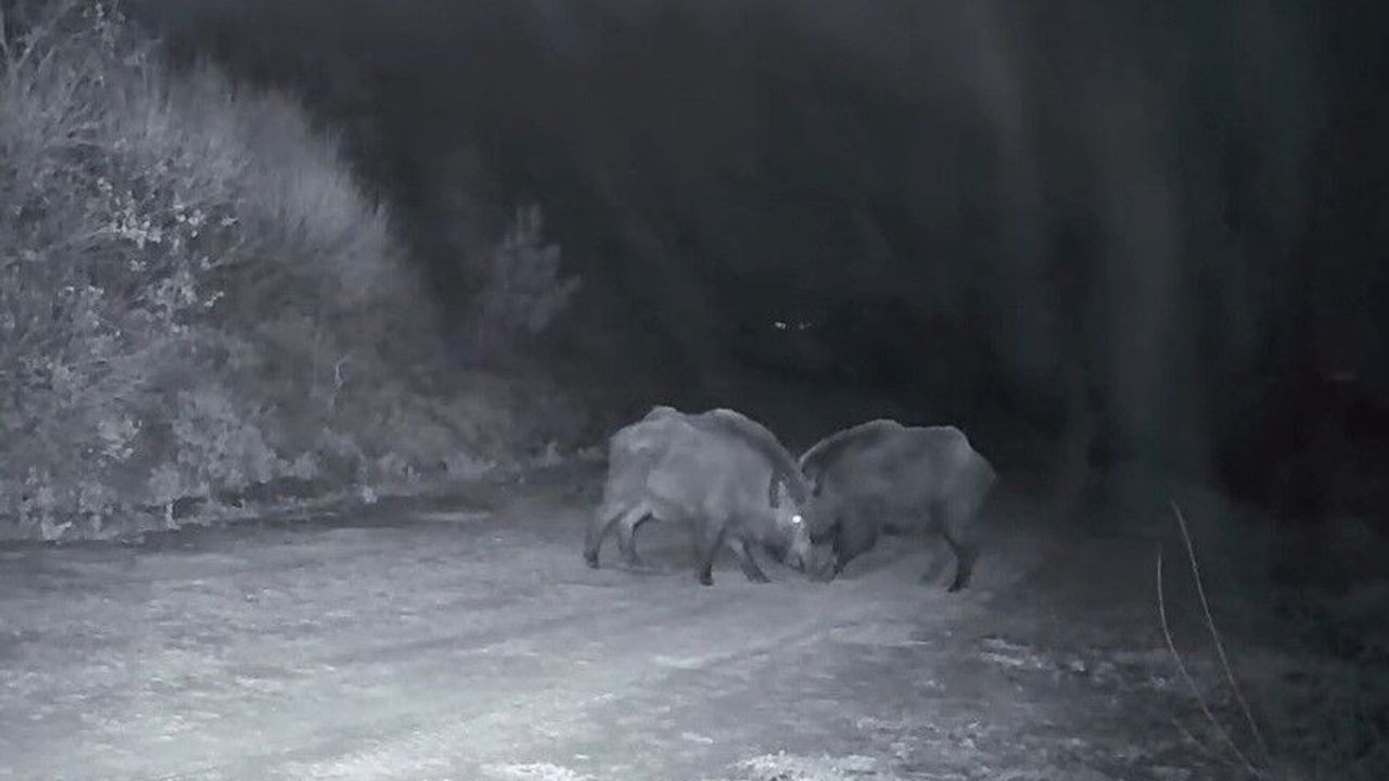 Tekirdağ'da Ganos Dağları'nda fotokapan kamerasına yansıyan görüntülerde, aynı anda kameranın iki farklı noktasında kavga eden domuzlar ilginç anlara sahne oldu.