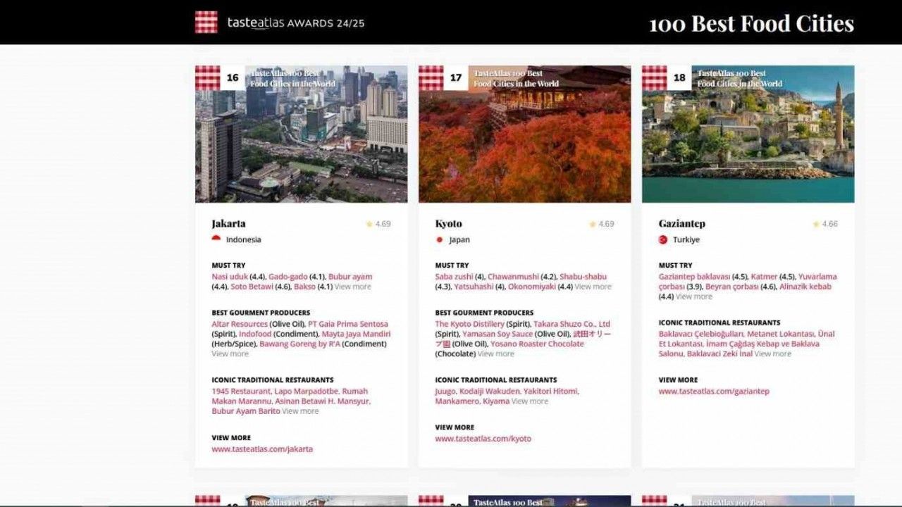 Dünyaca ünlü gastronomi platformu TasteAtlas tarafından açıklanan "Dünyanın En İyi 100 Yemek Şehri" listesinde Gaziantep 18’inci sırada yer aldı. Türkiye’den listeye giren bir diğer şehir İstanbul ise 24’üncü sıradan listeye dahil oldu.