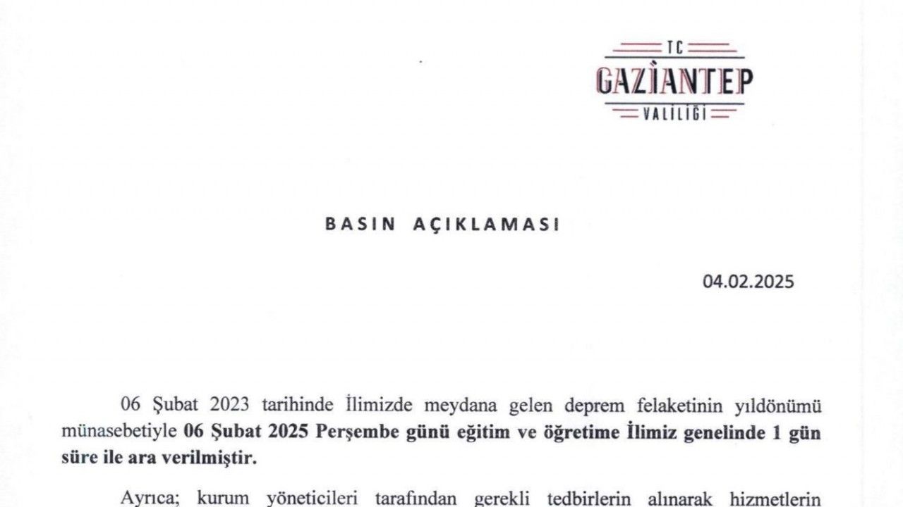 Konu ile ilgili Gaziantep Valiliğinden yapılan açıklamada, "6 Şubat 2024 tarihinde meydana gelen ve ilimizin de etkilendiği Kahramanmaraş merkezli depremlerin 2. yıl dönümü münasebetiyle İlimizde eğitim ve öğretime 1 gün süre ile ara verilmiştir. Ayrıca kamu kurum yöneticileri tarafından gerekli tedbirlerin alınarak hizmetlerin aksamaması ve zorunlu hizmetlerin yürütülebilmesi için asgari düzeyde personel bulundurulması kaydıyla anma programlarına katılacak, kabristan ziyareti yapacak kamu kurum ve kuruluşlarındaki çalışanlarda 6 Şubat 2025 Perşembe günü 1 gün idari izinli sayılacaktır" ifadelerine yer verildi.