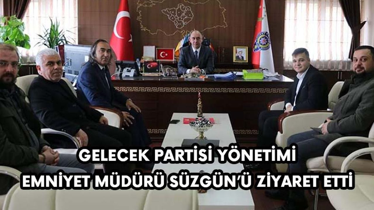 Gelecek Partisi Yozgat İl Başkanı Ömer Aydoğmuş ve beraberindeki il yöneticilerinin katıldığı ziyarette Yozgat ile ilgili bilgi alış verişinde bulunuldu. Gelecek Partisi Yozgat İl Başkanı Ömer Aydoğmuş, İl Emniyet Müdürü Kenan Şaban Süzgün’e nezaketi ve misafirperverliğinden ötürü teşekkür etti.