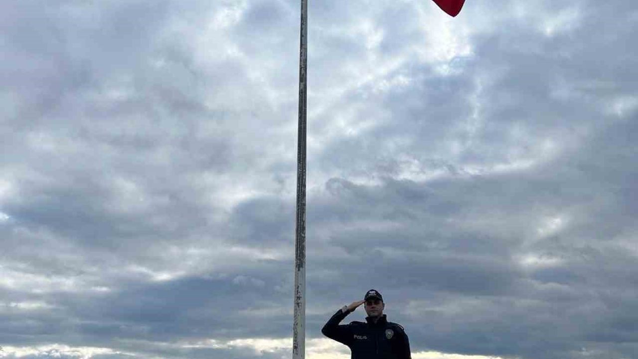 Valilik talimatıyla Çanakçı Kaymakamlığı tarafından görevlendirilen emniyet güçleri, yeni Türk bayrağını göndere İstiklal Marşı ve saygı duruşu eşliğinde çekti.