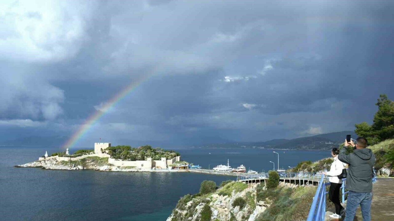 Türkiye’nin önemli turizm merkezlerinden olan Kuşadası’nda öğleden sonra aralıklarla sağanak yağmur etkili oldu. Yağmurun ardından güneşin açmasıyla birlikte ortaya çıkan gökkuşağı ise görenleri kendisine hayran bıraktı. Uzun süre kendini gösteren gökkuşağı, UNESCO Dünya Mirası Geçici Listesi’nde bulunan Tarihi Güvercinada Kalesi ve denizin mavi tonlarıyla birlikte eşsiz bir manzara oluşturdu. Yerli ve yabancı turistler, o anları cep telefonu kameralarıyla çekerek kaydetti. Gökkuşağı bir süre sonra gözden kayboldu. Geçmişi 13’üncü yüzyıla kadar dayanan ve Kuşadası’nın simgesi olan Tarihi Güvercinada Kalesi, her yıl binlerce yerli, yabancı turiste ve sadece Kuşadası’nda yetişen endemik bitki türü Tülüşah’a ev sahipliği yaparken, gökkuşağının renklerine de kucak açtı.