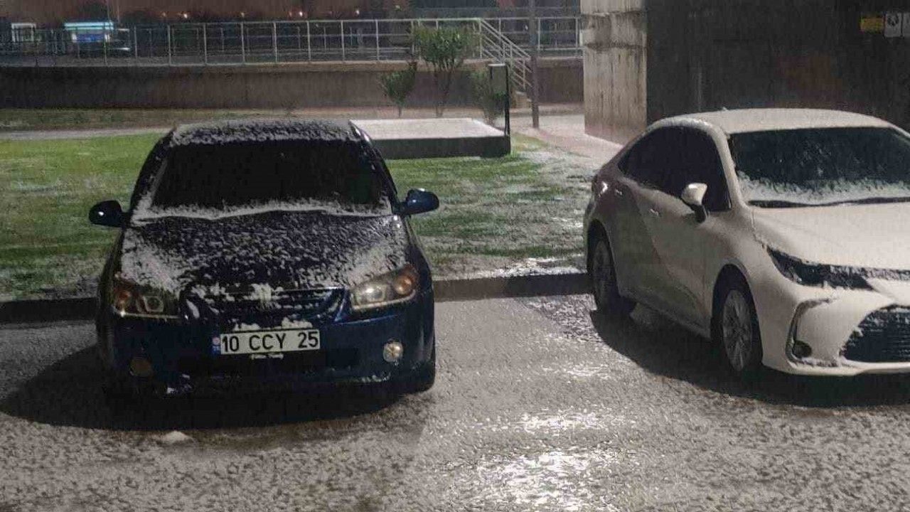 Balıkesir’in Gönen ilçesinde gece saatlerinde başlayan şiddetli yağış ve dolu, bölgeyi olumsuz etkiledi. Aniden bastıran dolu nedeniyle sürücüler ve yayalar zor anlar yaşadı.