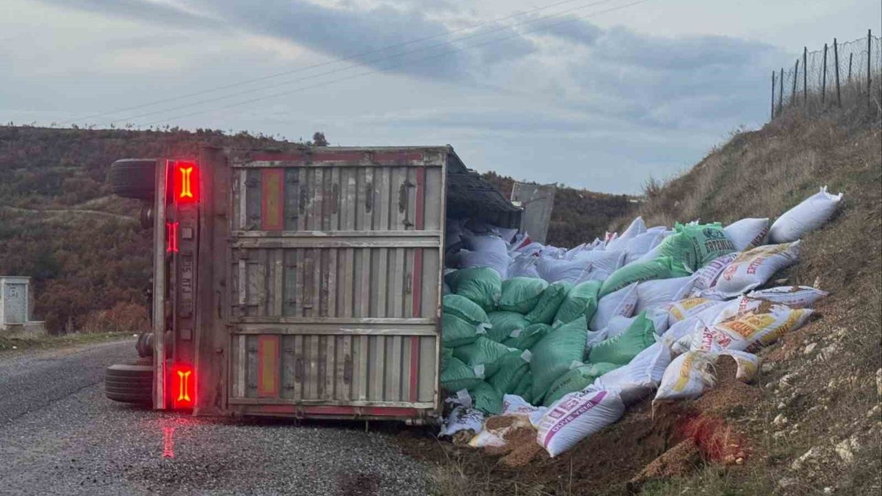 Manisa'nın Gördes ilçesinde yem yüklü bir tır, sürücüsünün virajı alamaması sonucu devrildi. Kazada 1 kişi yaralandı.