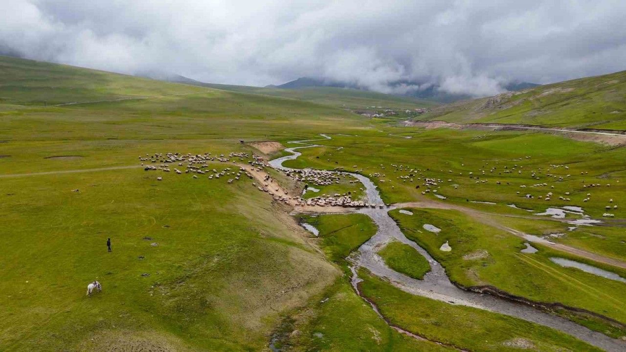 Dron kamerasıyla kaydedilen görüntülerde, yılan gibi kıvrılan menderesler ve bu akarsuların etrafında farklı tonlarda yeşil bitki örtüsünün oluşturduğu halımsı doku dikkat çekiyor. Özellikle kuşbakışı bakıldığında, beyaz koyunlar hareket eden kar tanelerini andırırken, pastoral görünüm adeta izleyenleri doğanın büyüsüne çekiyor.
