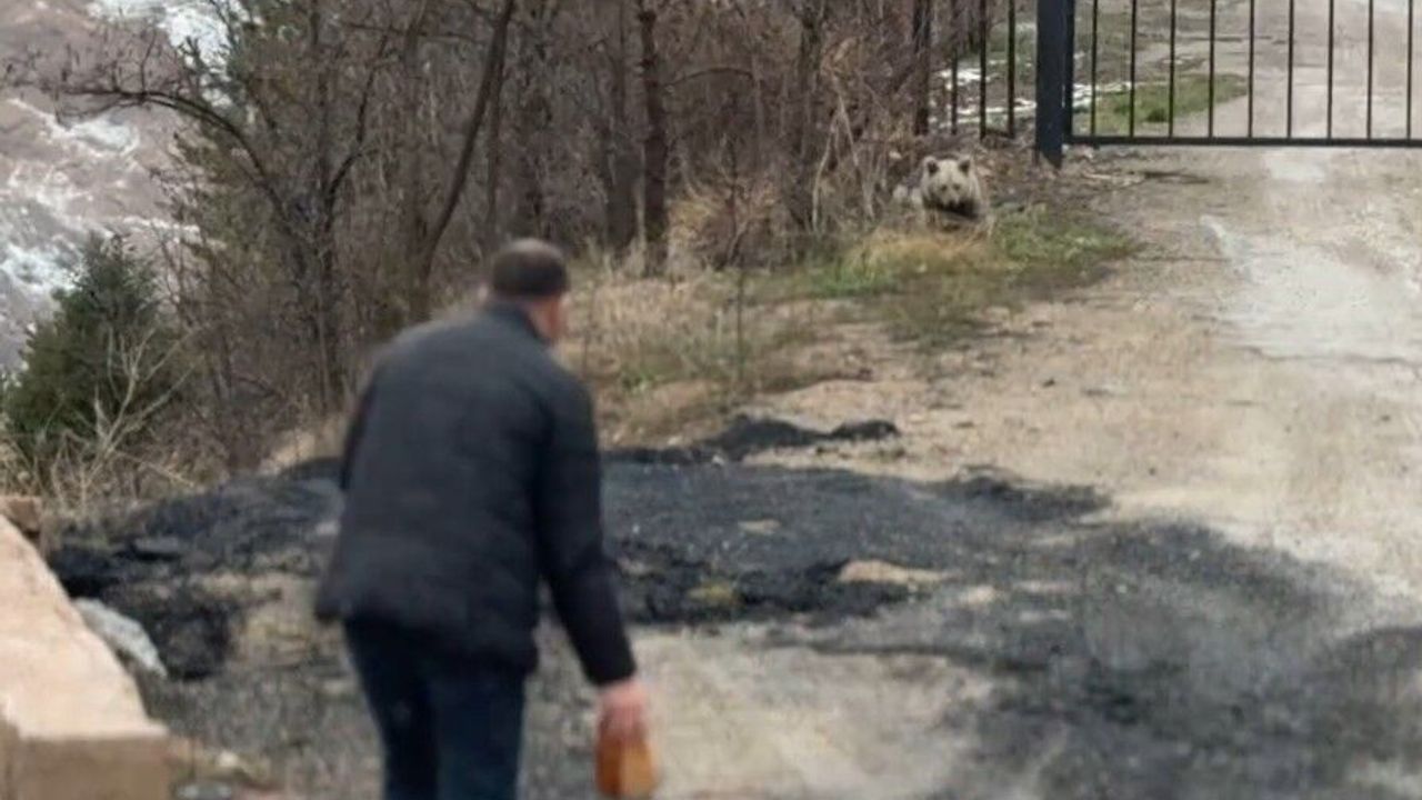 Gümüşhane'de aç kaldığı için köy merkezine yakın bir noktada otlayan ayıyı vatandaşlar elleriyle beslediler.