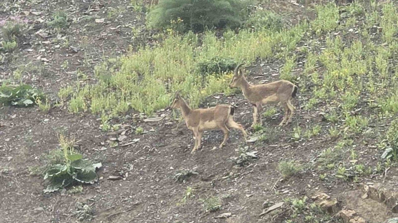 Hakkari-Van kara yoluna inen dağ keçileri, vatandaşlar tarafından ilgiyle izlendi.