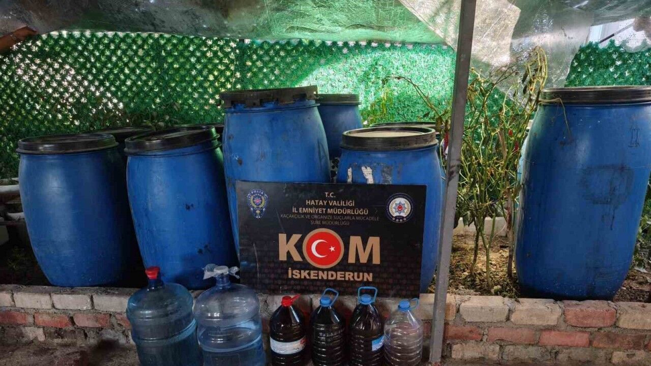 Hatay’ın Arsuz ilçesinde belirlenen 1 adreste yapılan aramada bin 250 litre sahte içki ve yapımında kullanılan fermente halde alkol ele geçirildi.