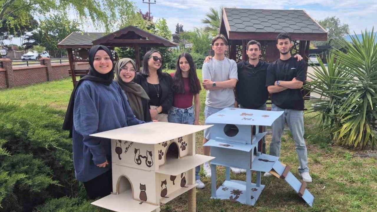 Balıkesir’in Havran ilçesinde Meslek Yüksekokulu öğrencileri, yerleşke içerisinde yaşayan sokak kedileri için kendi tasarımlarıyla kedi evleri yaptı.