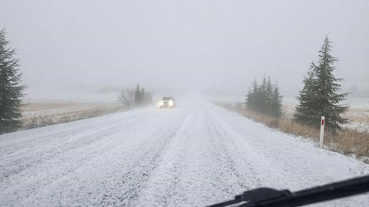Ankara'da Haymana ile Polatlı arasındaki yol, aniden bastıran dolu yağışıyla beyaza büründü. Yağışın etkisiyle trafik durma noktasına geldi.