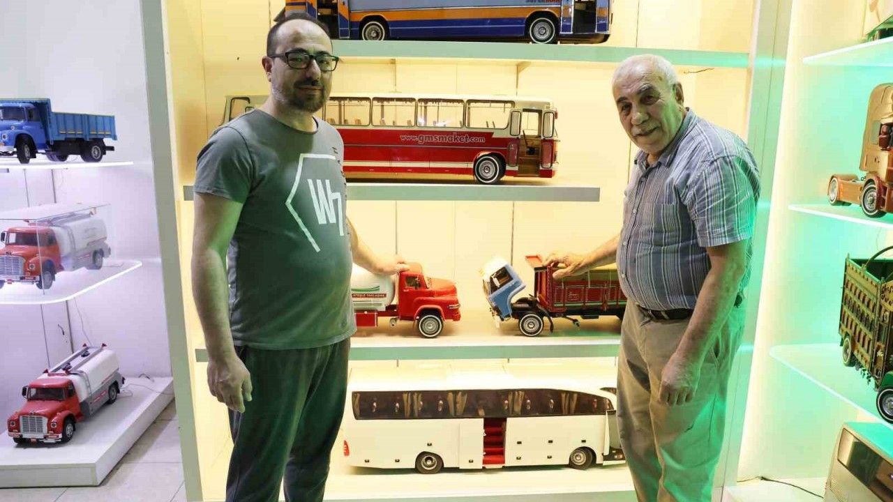 Baba İsmail Eruzumluoğlu ise, "Dünyada yüzde yüz el yapımı ile maket üreten tek yer burası. Buradaki ilk yaptığım maket olan otobüs maketine 10 yıl önce bir fuarda 100 bin TL teklif ettiler. Bundan 51 yıl önce 1974 yılında çekiç, keski, eğe, pense ve tornavida ile yapmıştım bu maketi. İlkel aletlerle yaptım. Saat zembereğinden de süspansiyonunu yaptım. Bu maketin hatırasının olduğunu, satılık olmadığını söyleyip kendisine yenisini yapmayı teklif ettim. Oğlum doğmadan 1 ay önce 1981 yılında bu kamyonu yaptım. Güner doğduğunda bu kamyonun kasasının içerisine sığıyordu annesi bunun içerisine yatırıp sallayıp uyutuyordu" diye konuştu.