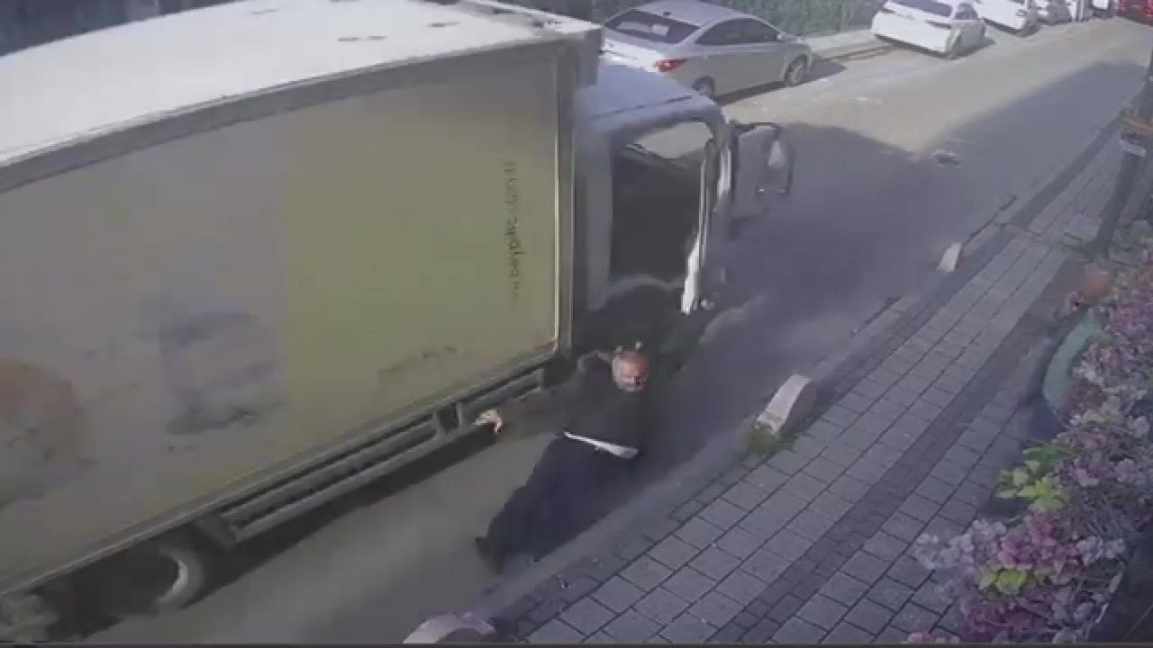 Sancaktepe’de hasarlı trafik kazasına karışan İETT otobüsü şoförü ile kamyonet sürücüsü arasında kavga çıktı. Kamyonetine binip ayrılmaya çalışan sürücüyü engellemek isteyen İETT otobüsü şoförü, kamyonetin dikiz aynasına tutundu. İETT şoförü, seyir halinde olan kamyonetin altında kalarak ağır yaralandı. O anlar güvenlik kamerasına yansıdı.