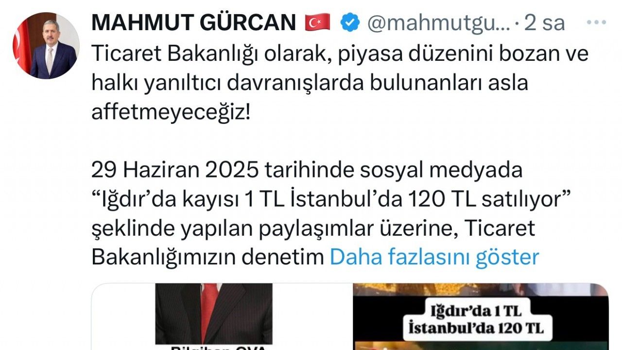 Ticaret Bakan Yardımcısı Mahmut Gürcan, sosyal medya hesabı üzerinden yaptığı açıklamada, kayısı satış ücretlerine ilişkin ilgili denetim ekiplerince inceleme başlatıldığını, konuya ilişkin paylaşımı yapan CHP Tuzluca Aday Adayı Bilgihan Ova’ya ulaşıldığını ve görüşmenin tutunakla kayıt altına alındığını belirtti. Gürcan, "Denetim ekiplerimizce yapılan incelemeler neticesinde, Bilgihan Ova isimli şahsın Çiftçi Kayıt Sistemi’ne (ÇKS) kayıtlı olmadığı, Hal Kayıt Sistemi’ne (HKS) kayıtlı olmadığı, herhangi bir vergi mükellefiyetinin bulunmadığı, Iğdır’da kayısının kilogram fiyatının 35-40 TL arasında olduğu, İstanbul’daki marketlerde ve satış noktalarında ise raf fiyatının kilogram başına 70 ila 90 TL arasında değiştiği tespit edilmiştir. Ayrıca, söz konusu şahsın daha önceki yerel seçimlerde Cumhuriyet Halk Partisi’nden Tuzluca Belediye Başkan adayı olduğu ve sosyal medya mecraları üzerinden kamuoyunu yanıltmaya yönelik siyasi paylaşımlar yaptığı tespit edilmiştir. İlgili şahıs, resmi tutanakta Iğdır’da kayısının 1 TL’ye satılmadığını açıkça ifade etmiş; söz konusu paylaşımda yer alan kayısıların sofralık olmadığını, meyve suyu üretiminde kullanılmak üzere tedarik edilen ürünler olduğunu beyan etmiştir. Bu çerçevede, kamuoyunu yanıltıcı ve piyasa dengesini bozucu nitelikte gerçek dışı bilgi yaydığı tespit edilen Bilgihan Ova adlı şahsa, Ticaret Bakanlığımız tarafından 1 milyon 400 bin TL tutarında idari para cezası uygulanmıştır. Ticaret Bakanlığı olarak, Üreticilerimizin emeğini değersizleştiren, tüketicilerimizi yanıltan ve piyasa düzenini bozan hiçbir girişime asla müsamaha göstermeyecek; bu tür girişimlerde bulunan kişi ve kurumlara karşı gerekli tüm yaptırımları kararlılıkla uygulayacağız" ifadelerine yer verdi.