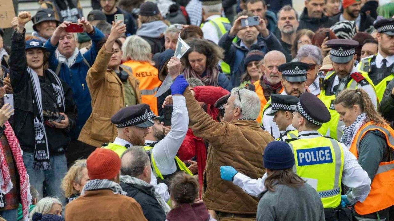 Dün Londra’daki Trafalgar Meydanı ve Westminster Köprüsü’nde bir araya gelen göstericiler, Filistin bayrakları dalgalandırarak, "Savaşı durdurun", "Yasağı kaldırın, suçlamaları kaldırın", "Barış" yazılı pankartlar taşımıştı. Londra polisi, protestoların başlamasından kısa bir süre sonra kalabalığa müdahale ederek göstericileri gözaltına almaya başlamış, gözaltına alınan kişiler direnmeden kalabalığın arasından geçirilirken, diğer göstericiler "Yazıklar olsun" sloganları atmıştı. Göstericiler ayrıca, Westminster Köprüsü’nde "Soykırıma karşıyım, Filistin Eylemi’ni destekliyorum" yazılı bir afiş açmıştı.