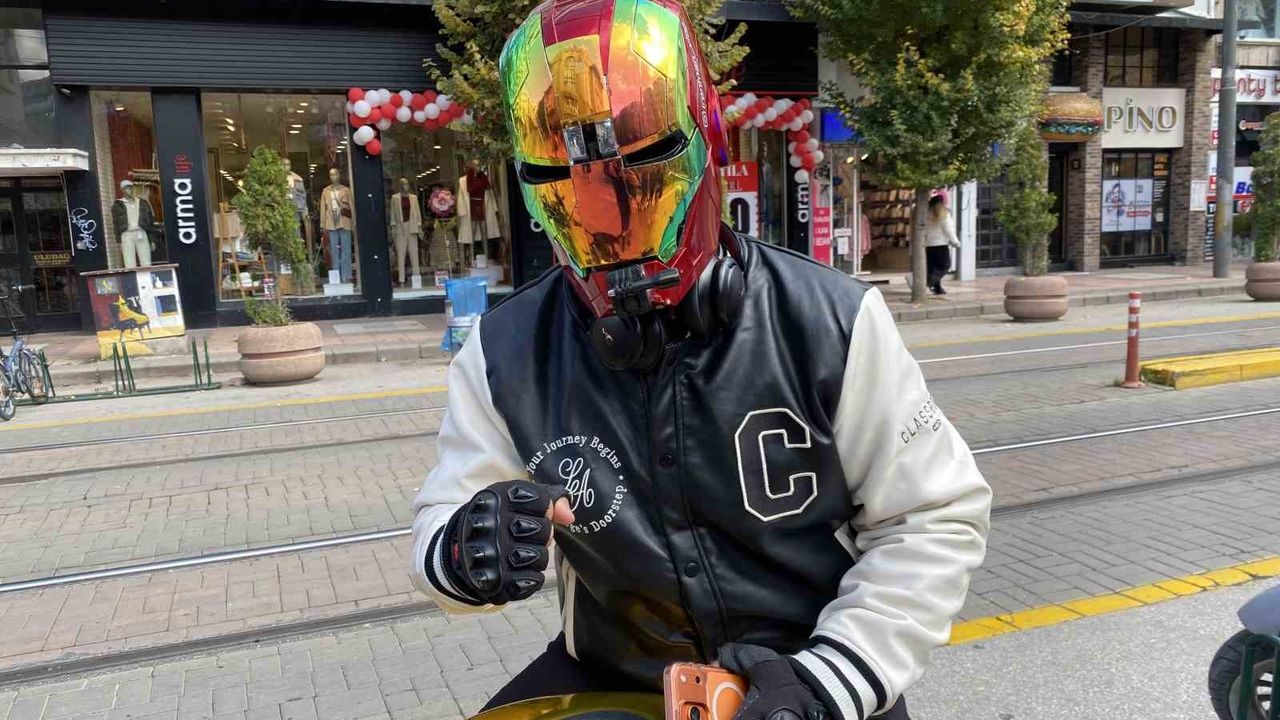 Eskişehir'de dünyaca ünlü çizgi roman karakteri İron-Man'in (Demir Adam) kaskı ile dolaşan motosiklet sürücüsü Bahadır Dülger, ilginç görüntüler oluşturuyor.