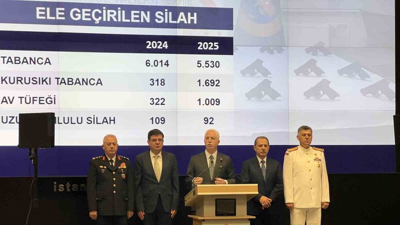 Ruhsatsız silah taşıyanların tutuklanan sayısında artış olduğunu ifade eden Vali Davut Gül, "Üzerinde hassasiyetle durduğumuz tedbirlerimizi sürekli artırdığımız başlıklardan biri de ruhsatsız silahlar. 2025 yılının ilk 6 ayında geçen senenin aynı dönemine göre yüzde 23 artışla 8 bin 323 silah ele geçirildi. 8 bin 557 kişi yakalandı. Tutuklanan kişi sayısı yüzde 123 arttı. Silahla işlenen suçların yüzde 90’dan fazlası ruhsatsız silahlarla işleniyor. Bu sebeple ruhsatsız silahlara karşı mücadelemize tavizsiz devam ediyoruz, edeceğiz" şeklinde konuştu.
