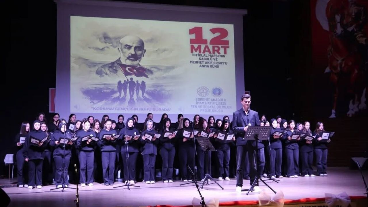 Balıkesir'in Edremit ilçesinde İstiklal Marşı'nın kabulünün yıl dönümü ve Mehmet Akif Ersoy'u anma programı, İlçe Milli Eğitim Müdürlüğü koordinesinde Edremit Anadolu İmam Hatip Lisesi tarafından hazırlanarak Şükrü Tunar Kültür Merkezi'nde gerçekleştirildi.