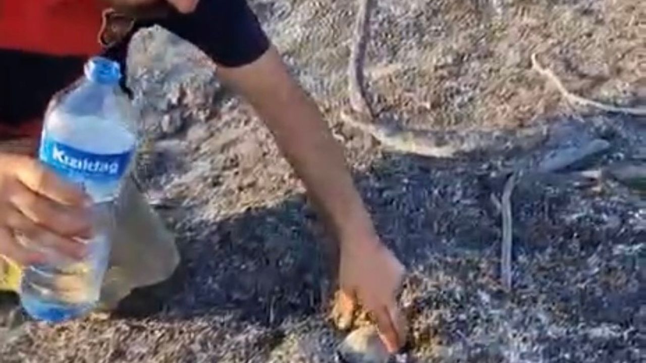 Hatay’ın Defne ilçesinde çıkan yangında alevler arasında mahsur kalan kaplumbağaya itfaiye personelinin can suyu verdiği anlar yürekleri ısıttı.