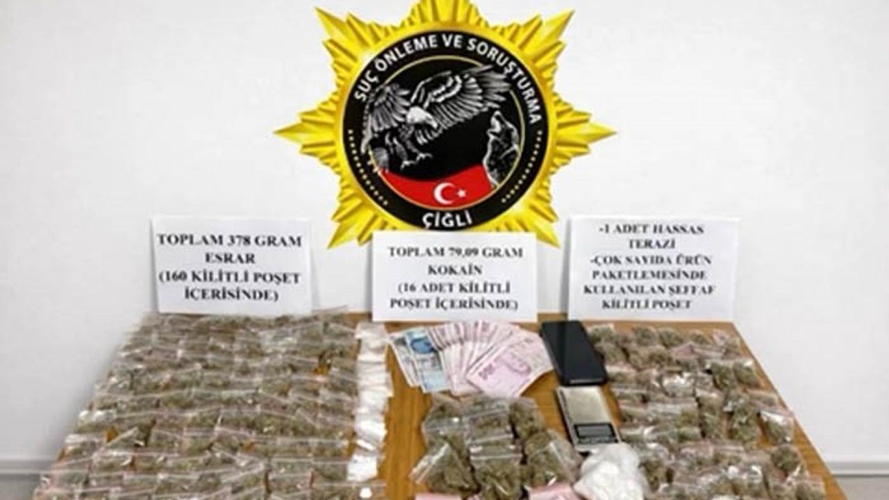 Çiğli İlçe Emniyet Müdürlüğü Suç Önleme ve Soruşturma Büro Amirliği ekipleri, Cumhuriyet ve Demokrasi Parkı içerisinde uyuşturucu ticareti yapıldığı ihbarı üzerine bölgeyi teknik ve fiziki takibe aldı. Saha çalışmaları kapsamında park içerisinde şüpheli hareketler sergileyen 16 yaşındaki E.A. isimli şahıs durduruldu. Henüz çocuk yaşta olmasına rağmen adeta bir uyuşturucu deposu gibi hareket eden E.A.'nın üzerinden çıkanlar polis ekiplerini bile hayrete düşürdü. Yapılan aramalarda; 160 ayrı kilitli poşet içerisinde toplam 378 gram esrar, 16 ayrı kilitli poşet içerisinde 79.9 gram kokain, uyuşturucu tartımında kullanılan 1 adet hassas terazi ile hazırlık için stoklanmış çok sayıda boş kilitli poşet ele geçirildi.