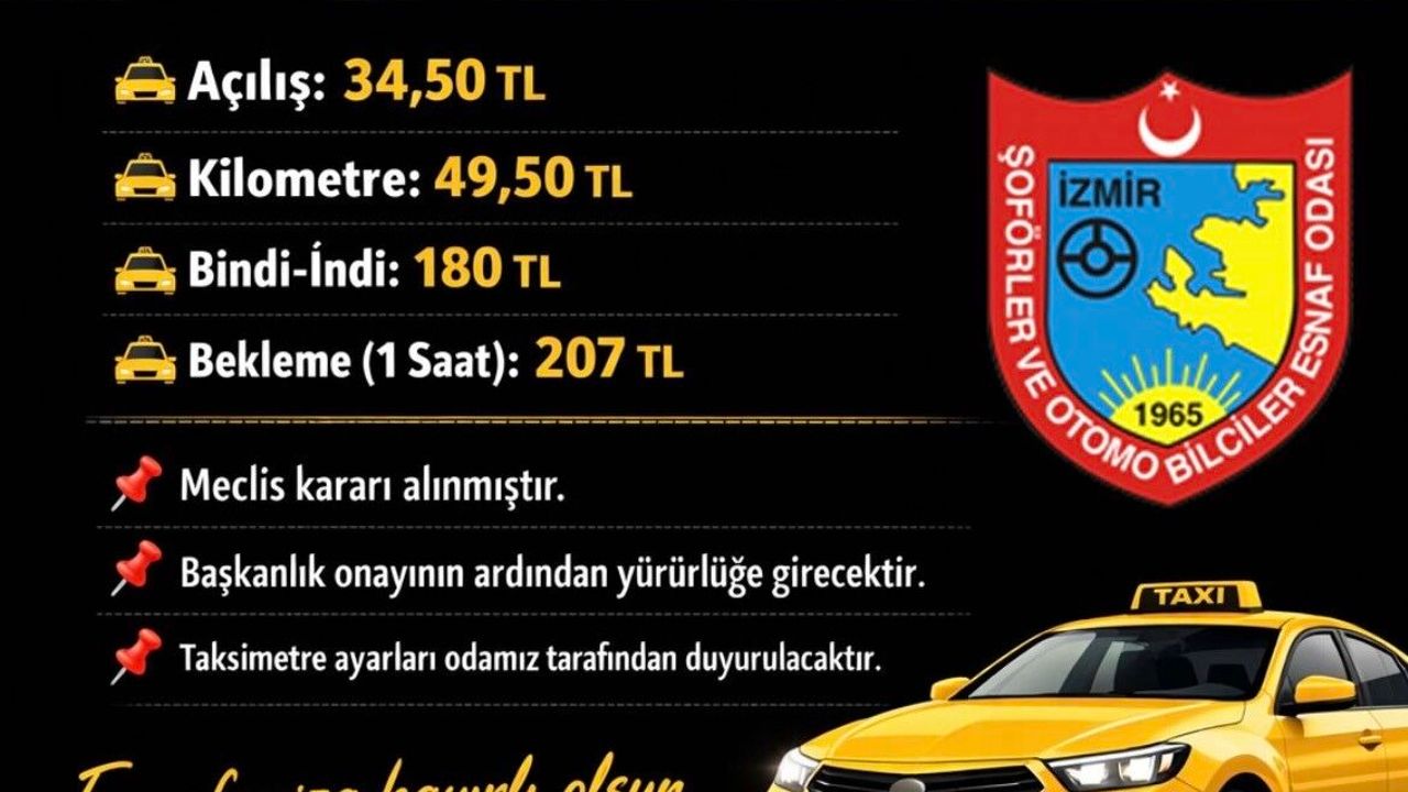İzmir Büyükşehir Belediyesi meclisi tarafından kentte uygulanacak yeni taksimetre ücret tarifesi kabul edildi. Karara göre taksilerde bindi indi ücreti 180 liraya yükseldi.