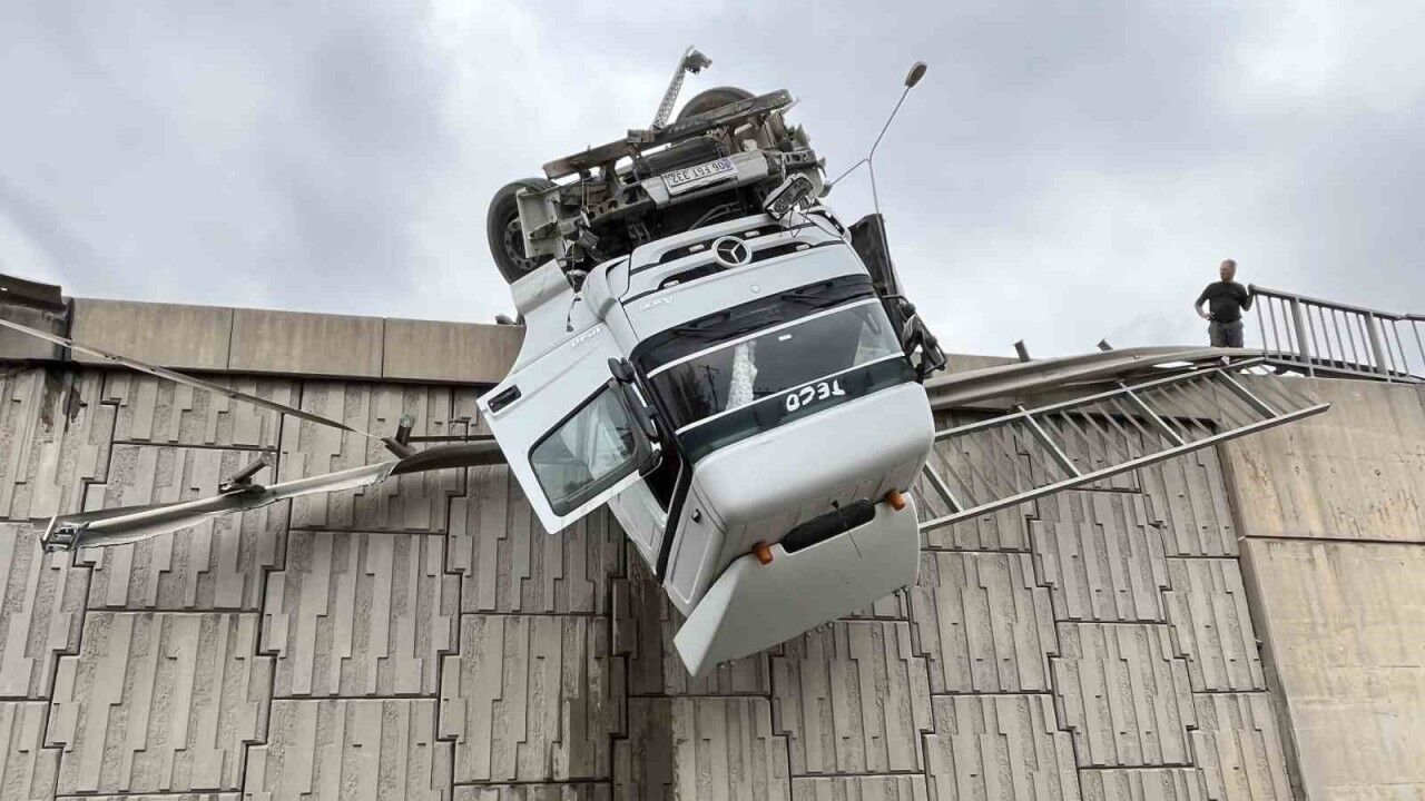 Öte yandan kaza anı ise bir güvenlik kamerasınca kaydedildi. Görüntülerde, viyadükte seyir halindeki tırın kontrolden çıkarak önce sola sonra sağa manevra yapıp viyadükten aşağıya sarkarak askıda kaldığı anlar yer aldı.