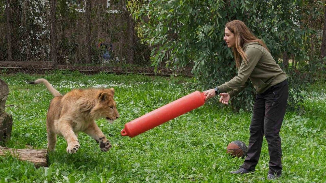 İzmir’in Torbalı ilçesinde güvenlik güçleri tarafından bir çiftliğe yapılan baskında ele geçirilen yavru aslan, İzmir Büyükşehir Belediyesi Doğal Yaşam Parkı’na teslim edildi. Henüz 10 aylık olduğu tahmin edilen ve uygun olmayan şartlarda yalnızca kedi maması ile beslendiği belirlenen yavru aslan bir ay süren tedavi ve bakımın ardından kendini toparladı. Minik yavru günlerini veteriner hekimlerin gözetiminde oyunlar oynayarak geçiriyor.