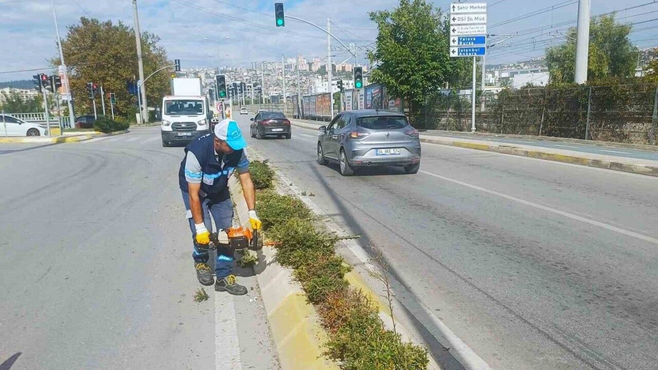 Kocaeli’nin İzmit ilçesi Salim Dervişoğlu Caddesi’nde tırpan ve form budama çalışması yapılıyor.
