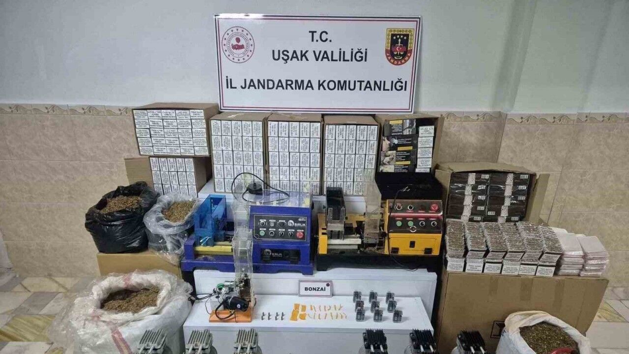 Uşak İl Jandarma Komutanlığı ekiplerince kaçakçılık olaylarını önlemeye yönelik yürütülen çalışmalar kapsamında, D.Ç. (41) isimli şüphelinin kent merkezinde bulunan adresinde yapılan aramada çok sayıda uyuşturucu madde ve kaçak ürün ele geçirildi. Adreste yapılan aramada; 19 adet satışa hazır kağıda emdirilmiş bonzai, 9 adet elektronik sigara, 3 adet elektrikli tütün sarma makinası, 2 adet kompresör, 7 bin 200 adet bandrolsüz içi tütün doldurulmuş dolu makaron, 57 bin 600 adet bandrolsüz boş makaron, 60 kilogram kıyılmış bandrolsüz tütün ve 8 adet tabanca fişeği ele geçirildi.