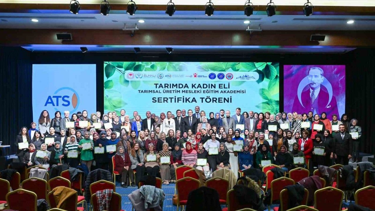 Antalya’nın Elmalı ilçesinde "Tarımda Kadın Eli" projesi kapsamında eğitimlerini tamamlayan 100 çiftçi kadına sertifikaları verildi.