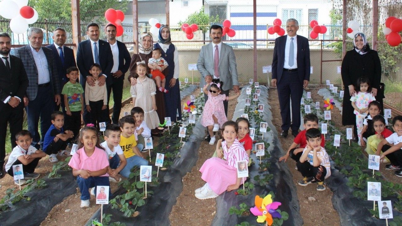 Konuşmaların ardından minik öğrenciler, büyük bir heyecanla kendi diktikleri çilekleri toplarken, etkinliğe katılan Kaymakam Muhammed Üsame Soysal, İlçe Belediye Başkanı Mehmet Can Hallaç, İlçe Milli Eğitim Müdürü Lütfü Başli ve protokol üyeleri de bu sevince ortak oldu.