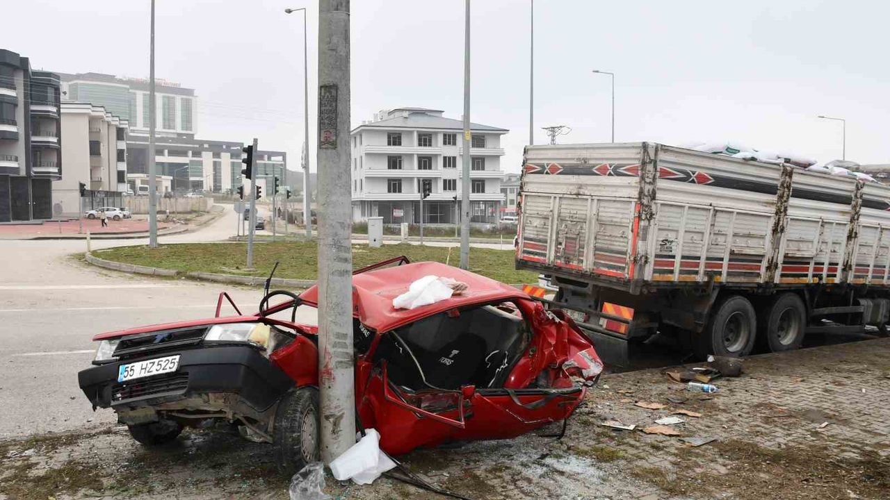 Samsun'un Vezirköprü ilçesinde kırmızı ışıkta bekleyen Tofaş otomobile kamyonun çarpması sonucu araç adeta kağıt gibi katlandı, 4 kişi yaralandı.