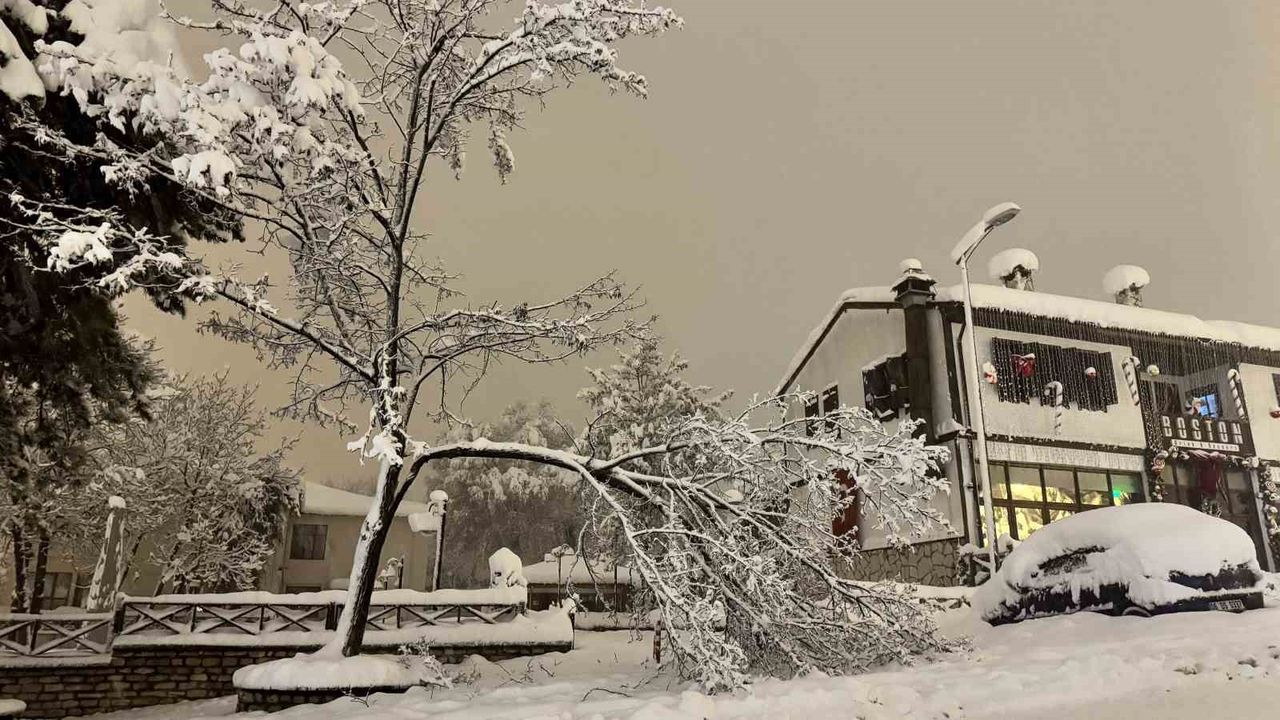 Karabük'ün Safranbolu ilçesinde etkisini sürdüren kar yağışı nedeniyle birçok noktada karın ağırlığına dayanamayan ağaçların dalları kırıldı