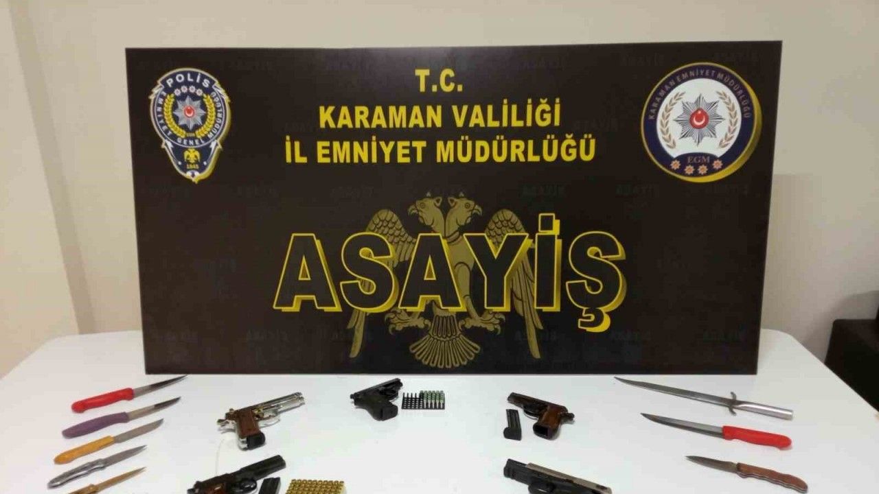 Karaman’da polisin yaptığı asayiş uygulamalarında uyuşturucu, kaçak tütün ve ruhsatsız silahlar ele geçirilirken, çeşitli suçlardan aranan 6 şahıs tutuklandı.