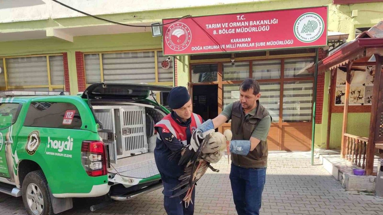 Karaman’da jandarma tarafından yaralı halde bulunan leylek, Doğa Koruma ve Milli Parklar Şube Müdürlüğüne teslim edilerek koruma altına alındı.