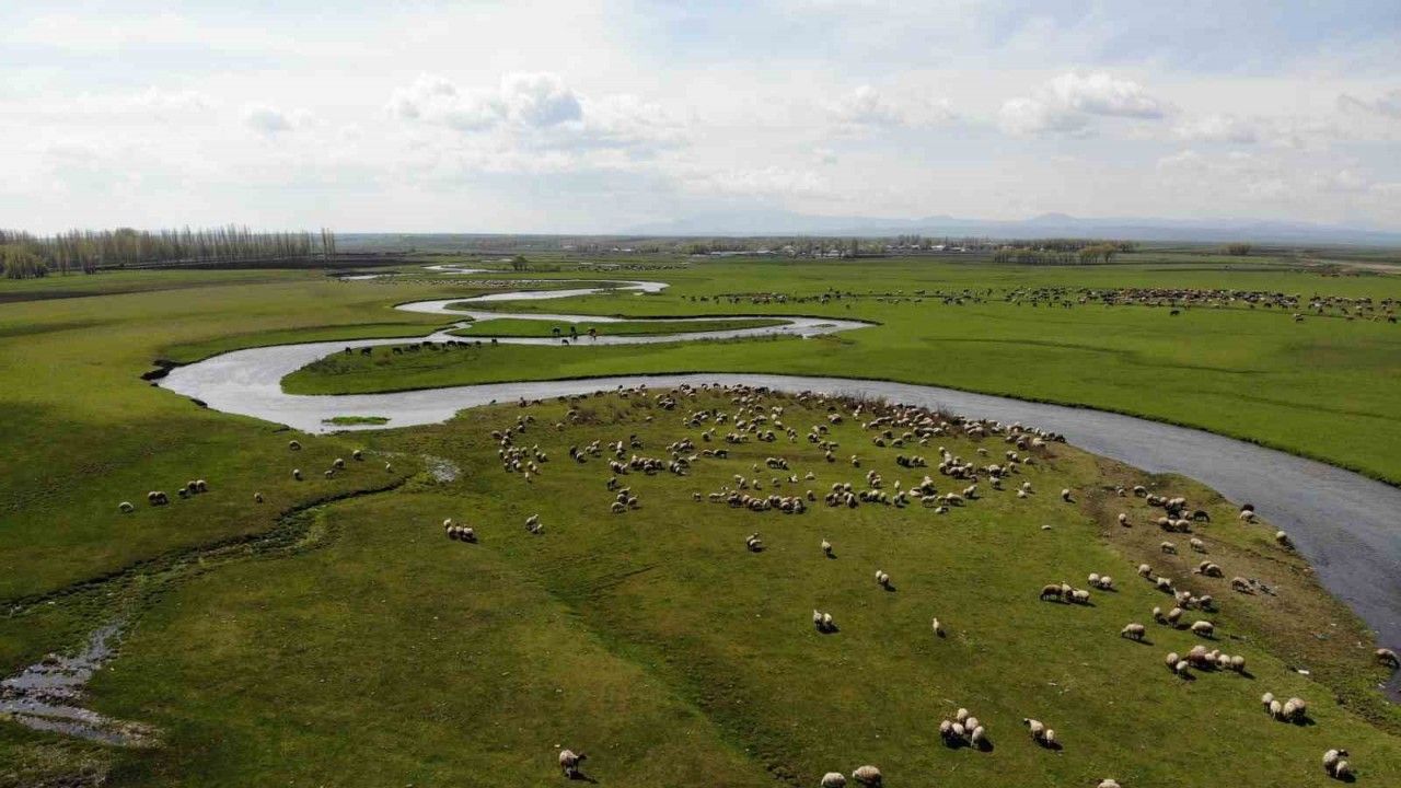 Öte yandan, bahar ayın ile birlikte yeşeren meralara yayılan hayvanlar, kameralara yansıdı. Büyük ve küçükbaş hayvan sürülerini yeşeren meralara çıkararak otlatmaya başladı. Arpaçay çayının etrafında yayılan hayvanlar renkli görüntüler ortaya çıkardı.