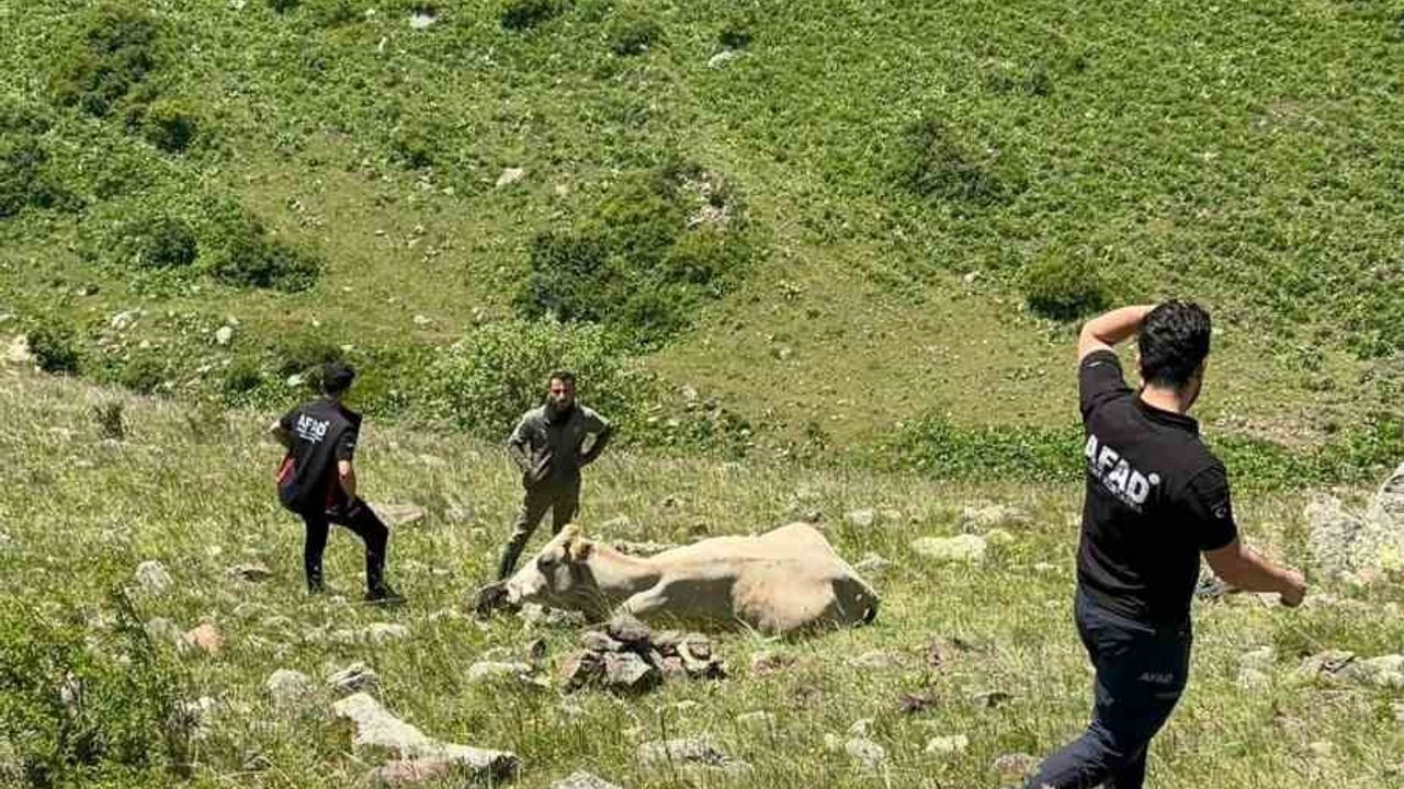 AFAD İl Müdürlüğü ekipleri, ineği halat yardımıyla 1 saatlik çalışma sonucu kurtarıp sahibine teslim etti.