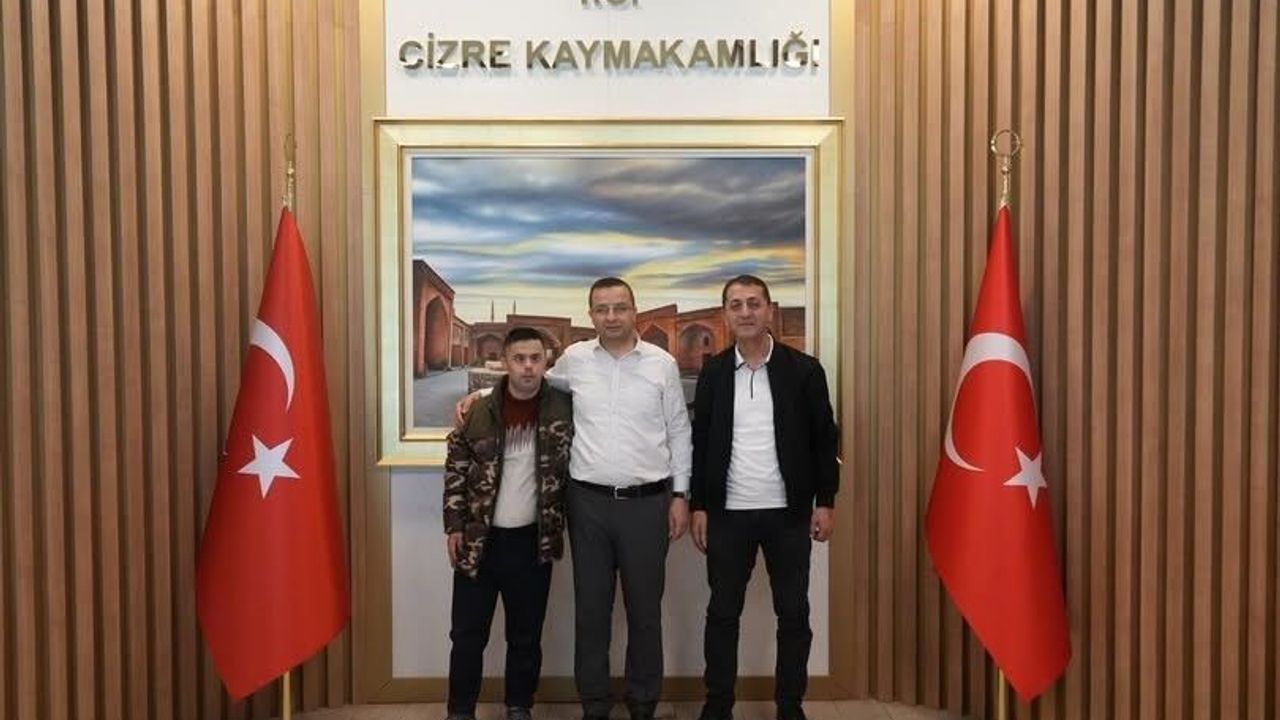 Şırnak'ın Cizre İlçe Kaymakam Ahmet Vezir Baycar, ilçenin sevilen simalarından down sendromlu Erdal Caba'yı makamında ağırladı.