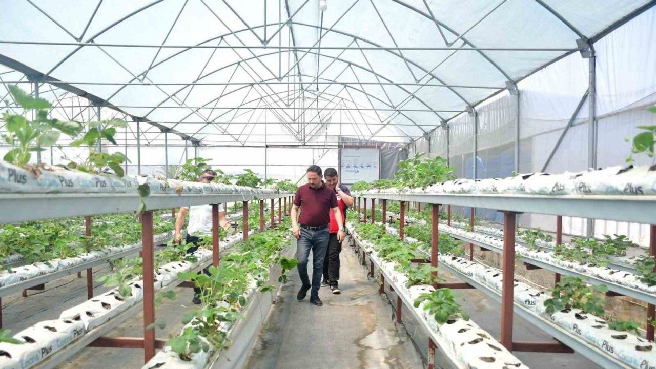 Biga Kaymakamı Ercan Kayabaşı, Hacıköy köyünde topraksız çilek üretim serasını ziyaret etti.