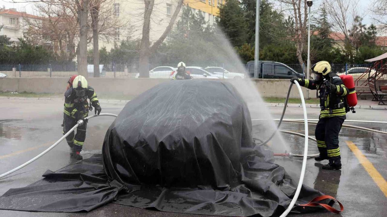 Elektrikli araç yangınlarına karşı mücadelede kendilerini geliştirmek için çalışma yürüttüklerini dile getiren Kızılkan, 'Kayseri Büyükşehir Belediyesi olarak, dünya genelinde elektrikli araç yangınlarına nasıl müdahale edildiğini yakından takip ediyoruz. Yaşadığımız olaylar, tecrübemizi hızla artırmaktadır. Normalde fosil yakıtlı bir araçta meydana gelen yangın 1-3 ton su ile söndürülebilirken, elektrikli araç yangınlarında bu miktarın 40 ton ve üzerine çıktığı görülmektedir. Dünya genelinde ve Türkiye'de su bazlı söndürme maddeleri üzerine araştırma ve Ar-Ge çalışmaları devam etmektedir. Bataryaya nasıl müdahale edileceği konusunda da kendi yeteneklerimizi ulusal ve uluslararası platformlarda paylaşmaktayız. Bir batarya yangınının söndürülebilmesi için batarya içerisindeki ısıl değerin 60 derecenin altına, tercihen 40-50 derece seviyelerine düşürülmesi gerekmektedir. Termal kaçak olarak adlandırılan durum, ısının yükselmesiyle birlikte birçok riski beraberinde getirmektedir. Bu süreçte toksik gazlar, özellikle hidrojen florür gazı açığa çıkabilmektedir. Bu nedenle müdahale edecek ekiplerin temiz hava solunum cihazlarını kuşanmasını, termal ölçümler yaparak ve gaz ölçümleriyle salının gazın değerlerini tespit etme yeteneğimizi hızla geliştiriyoruz. Yangın söndürme örtüsünden beklentimiz yangının soğutma işlemini gerçekleştirirken çevreye zararın önlenmesi, yangının belli bir yere hapis edilmesi ve salınım gazlarının kısmen kontrol altına alınması. İnsanların ve çevrenin kirlenmesi kısmında kısmi bir önlem almak. Kullanılan her kimyasal veya su, bataryada meydana gelebilecek atık maddeler olsun bunların çevreyle ilgili hem bize hem de geleceğimize tehdit oluşturduğunu paylaşmak isterim. Tüm elektrikli araç sahipleri özellikle araçların tamir, bakım ve servis hizmetlerini yetkili servislerde yaptırmalarını tavsiye ediyoruz. Şarj ederken mutlaka kablo açık olmasını tavsiye ediyoruz' ifadelerini kullandı.