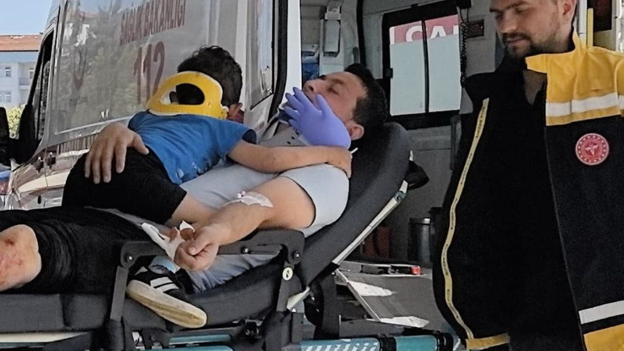 Bursa’nın İnegöl ilçesinde otomobilin çarptığı motosikletteki 2’si çocuk 3 kişi yaralandı. Sağlık ekipleri, müdahalenin ardından yaralı çocuğa muayene eldiveniyle balon yapıp verdi.