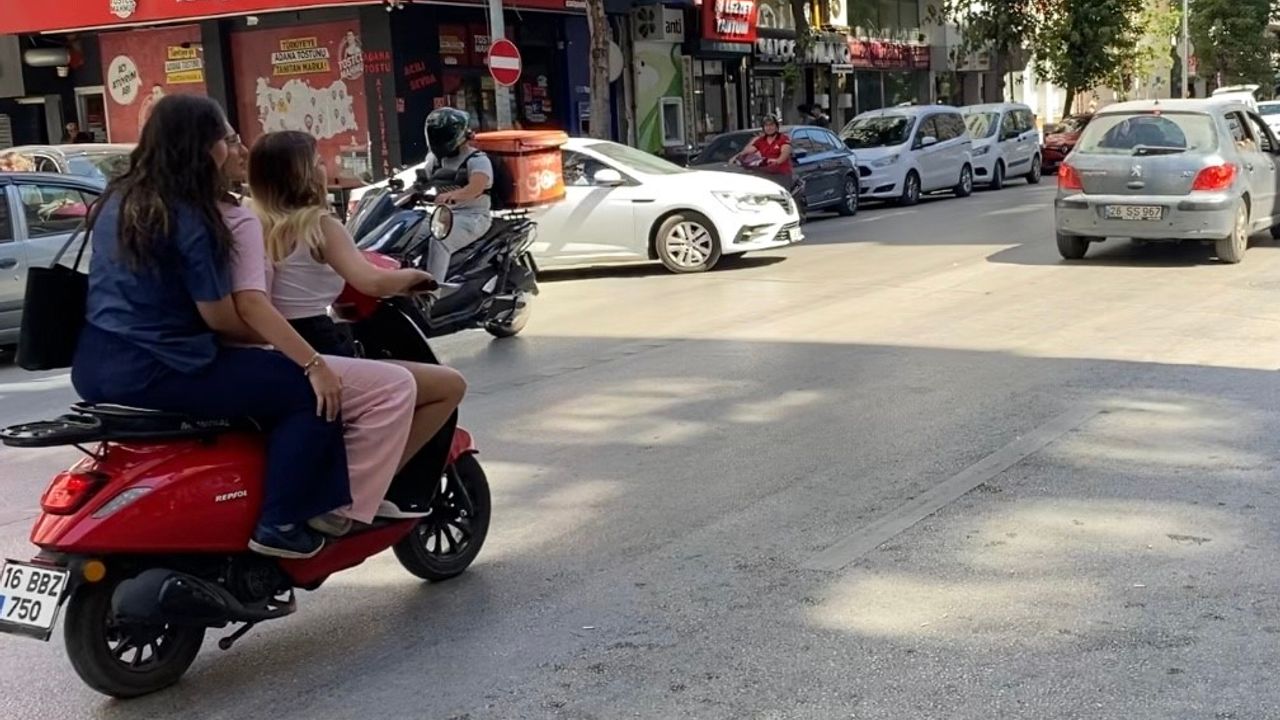 Eskişehir’de kask takmadan aynı motosiklete binen 3 kadın ilginç bir görüntü oluşturdu.