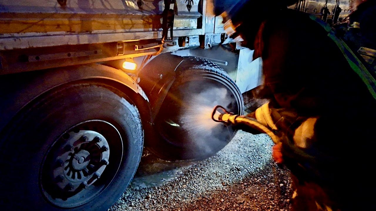 Konya’nın Kulu ilçesinde kereste taşıyan tırın dorse tekerleğinden dumanlar yükselince paniğe sebep olurken, itfaiye ekipleri soğutma çalışması yaptı.