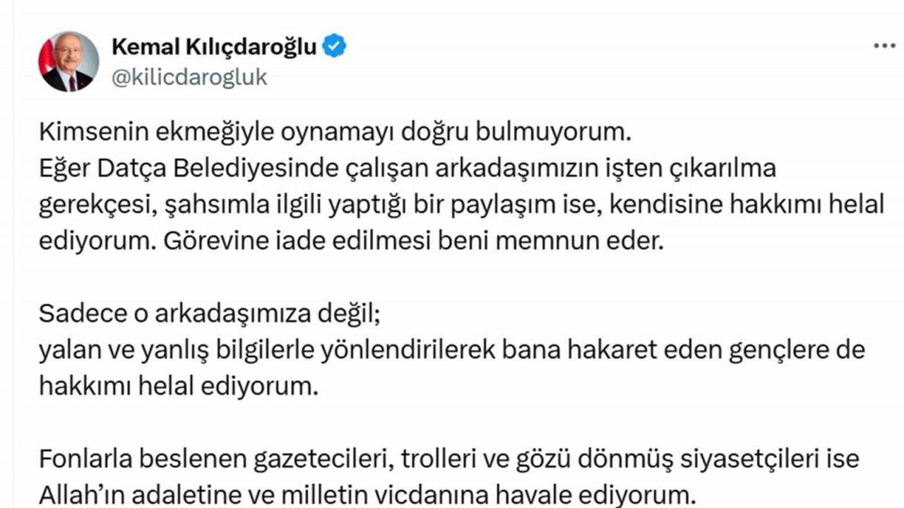 Bir sosyal medya kullanıcısının eski CHP Genel Başkanı Kemal Kılıçdaroğlu ile ilgili Datça’da ‘Tatil’ paylaşımına Datça Belediyesi resmi sosyal medya hesabından ‘Maalesef doluyuz’ cevabı sonrası bir çalışanın işten çıkarıldığına ilişkin Kemal Kılıçdaroğlu "Kimsenin ekmeğiyle oynamayı doğru bulmuyorum’ diyerek paylaşım nedeniyle görevden alındıysa yöneticinin iade edilmesini istedi.